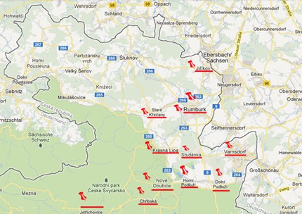 Rumburk, Varnsdorf, Studánka, Jiříkov, Staré, Nové a Dolní Křečany, Vlčí Hora, Krásná Lípa, Zahrady, Horní a Dolní Podluží, Jiřetín pod Jedlovou, Doubice, Kyjov, Brtníky, Jetřichovice, Chřibská, Rybniště.